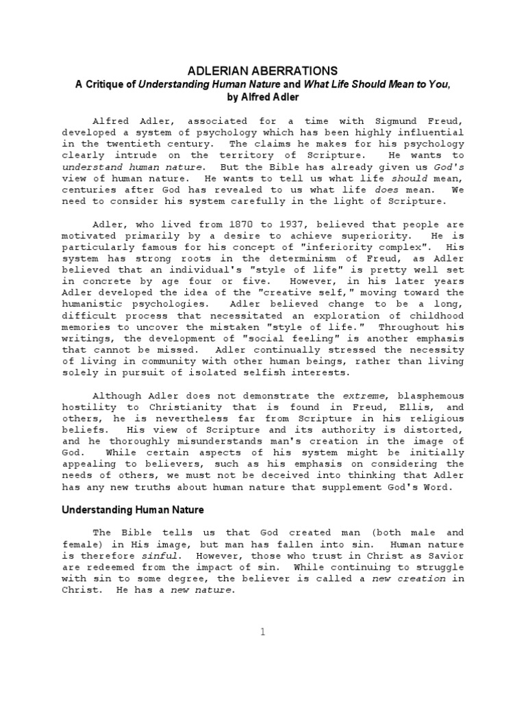 Many of his later writings such as what life should mean to you 1931 were directed to the general reader. It would not be easy to find another author from which so much has been borrowed from all sides without acknowledgment than alfred adler. The viennese psychoanalyst alfred adler was one of the first theorists to address such individuals by defining the quality of striving for superiority adler who also coined the term. Alfred adler could not accept sigmund freud s strong emphasis on sexual factors as motivators of behavior.
