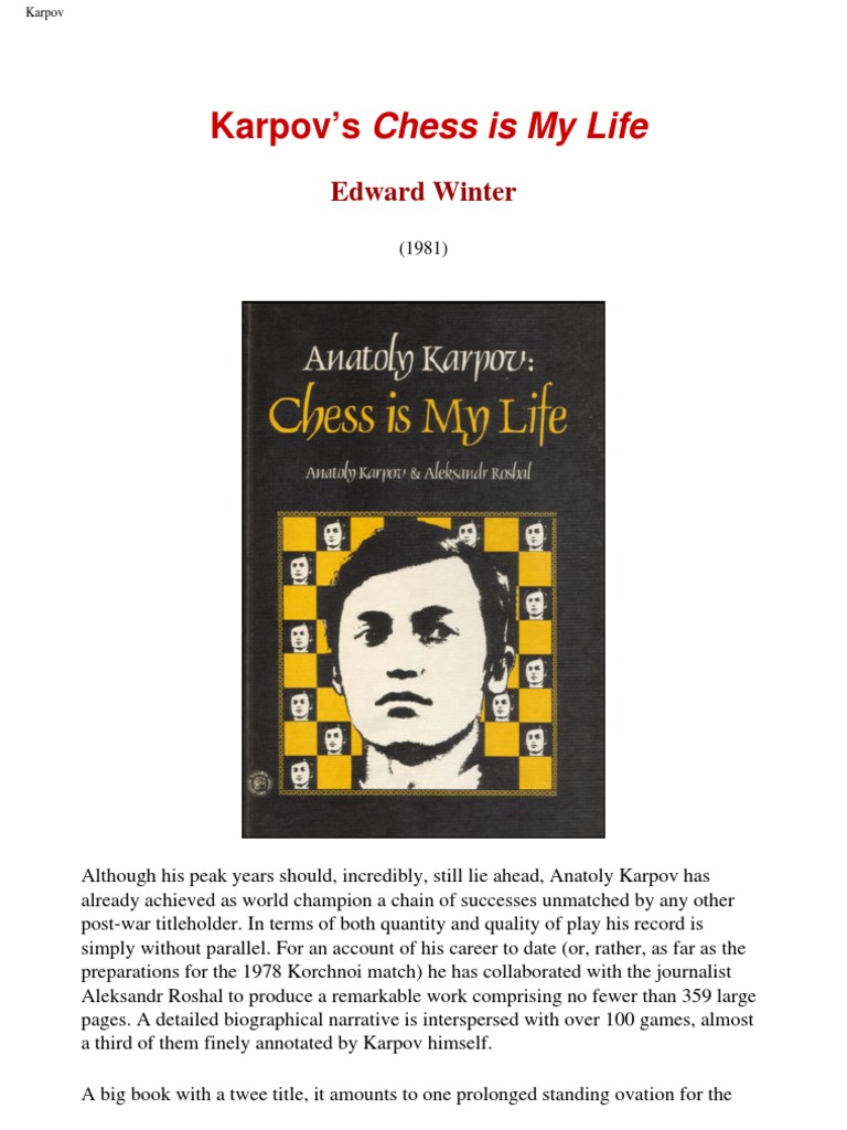 Chess is my life karpov. The world chess championship karpov kasparov moscow 1985 raduga publishers 1986 it is of course unknown how the 1984 match might have ended. Nonetheless kasparov also credited karpov with providing a true fight for the title. Karpov was born on may 23 1951 in zlatoust in the urals region of the former soviet union and learned to play chess at the age of four. One thief distracted him while the other attacked from behind and stole his briefcase with the 300 page manuscript.