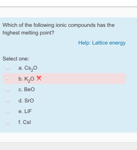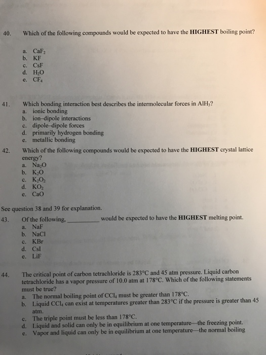 See standard state and enthalpy of formation gibbs free energy of formation entropy and heat capacity for thermodynamic data for the same compounds. Since filled d or f subshells are seldom disturbed in a chemical reaction we can define valence electrons as follows. Ethanol has a higher boiling point because of greater london dispersion force c. The reason why ce naf would have the highest melting point is because if you look at the electronegativity values fluorine has the highest hence it have the greatest pull or attraction towards the electrons in the ionic bond resulting in a really strong sodium positive ion and a strong negative fluorine ion this thereby results in a high.