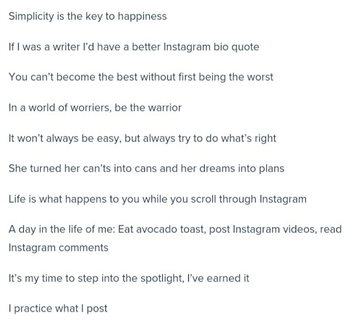 An instagram bio may seem like an afterthought you re too busy coming up with savage captions but in reality it s the first impression you re giving off when someone comes across your page do. But if you really want to find great examples for an instagram bio you can go to your favorite instagram accounts influencers or business pages to get some ideas and inspiration. Life is too short don t waste it reading my instagram bio.