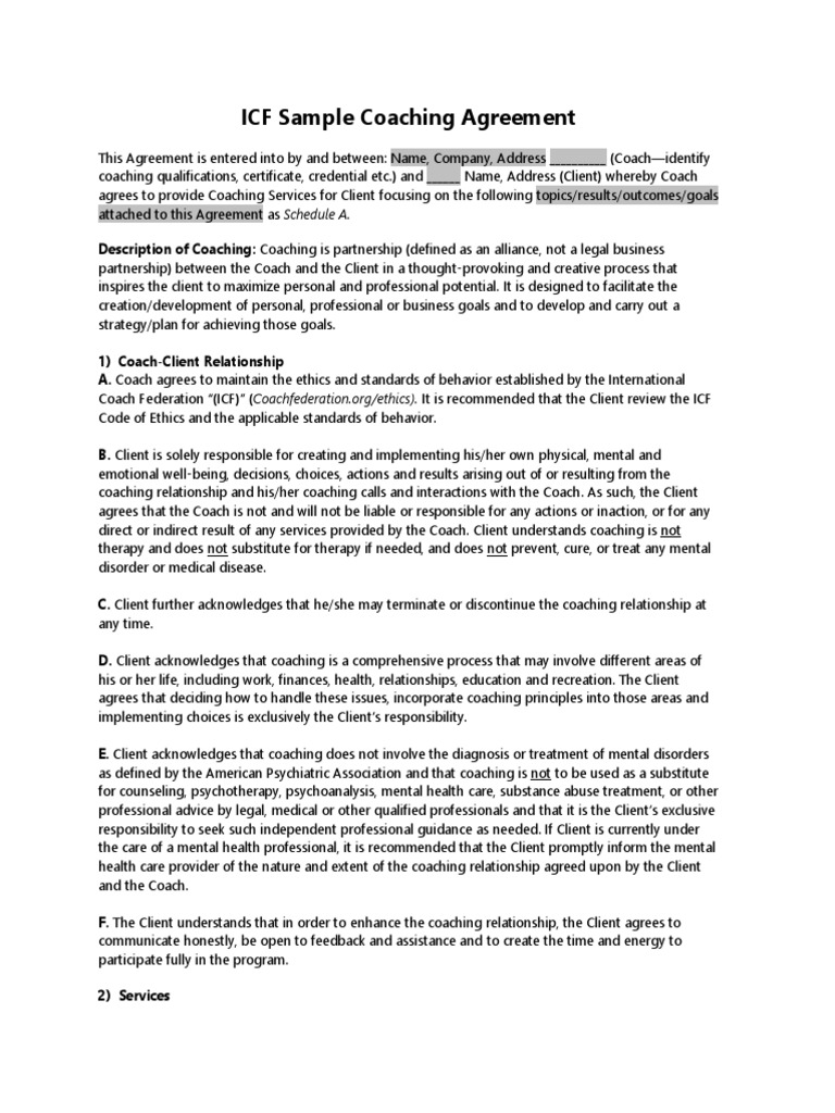 Coaching contract or agreement more than the broader coaching agreement as mentioned above it s helpful to have an actual coaching agreement or contract for your client to sign. The parties in this document are the coach who provides the coaching services and the client the recipient of such services. An effective coaching would help a person gain a peace of mind and a mindset that will enable him or her to push with his or her goals in life and last but not the least an effective coaching would also increase the effectiveness and the way of thinking of every employee who seeks to be coached and this can drastically improve his or her work. A legally binding document that s perfect for people looking to start offering coaching services to clients.