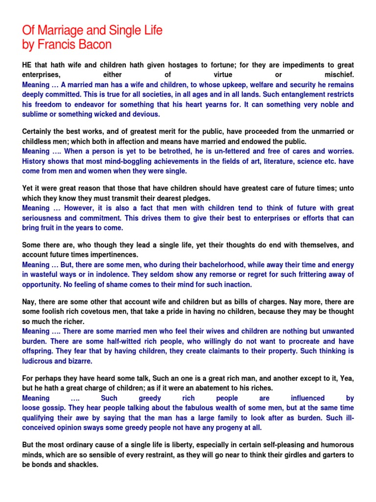 of marriage and single life by francis bacon summary and analysis